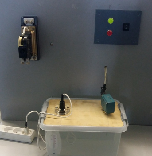 После составления таблицы, включается нагревательный элемент в сеть, и ожидается срабатывание датчика-реле температуры. Фото стенда при температуре воды меньше значения уставки представлено на рисунке 4.3