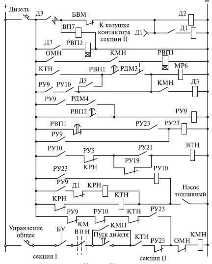 Включение системы пуска дизеля осуществляется кратковременным нажатием кнопки «Пуск дизеля», в результате чего включится контактор маслопрокачивающего насоса КМН. Контактор КМН: