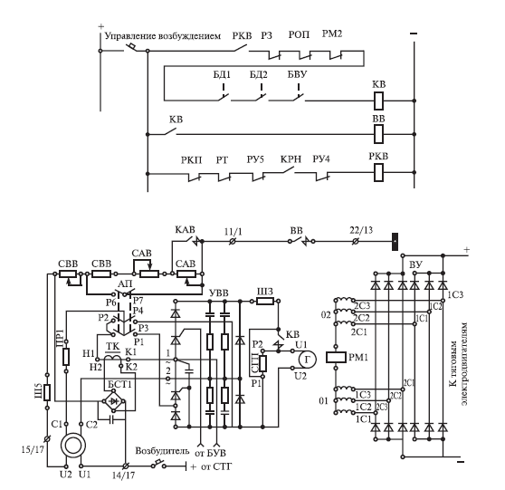 Для включения возбуждения тягового генератора должны быть включены автоматы «Возбудитель» и «Управление возбуждением»,расположенные на высоковольтной камере, и «Питание БУВ. Тогда через контакты выключателя «Управление возбуждением» включатся: