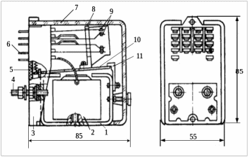 Рисунок 1.9 – Схема промежуточного реле ТРПУ-1-412 [10]: 1 – скоба; 2 – сердечник; 3 – корпус пластмассовый; 4 – шпилька; 5 – пружина; 6 – вывод; 7 – кожух пластмассовый; 8 – траверса; 9 – контакты; 10 – якорь; 11 – угольник