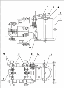 Рисунок 1.6 – Реле промежуточное типа РПУ-3М-114Т [10]: 1 – пружина возвратная; 2 – пластина немагнитная; 3 – якорь; 4 – сердечник; 5 – катушка; 6 – скоба магнитная; 7 – колодка толкающая; 8 – траверса; 9 – колодка; 10 – угольник контактный; 11 – мостик контактный; 12 – пластина регулировочная; 13 – пружина плоская