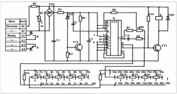 Реле (рисунок 1.2) состоит из блока питания (выпрямительный мост VD1, резистор R1, резистор R2 и конденсатор C1), стабилизатора напряжения (резистор R3, стабилитрон VD2), схемы установки в ноль (резисторы R4, R5, конденсатор C2, транзистор VT1), генератора импульсов (микросхема D, конденсатор C4, резисторы R6-R9 и набор резисторов R11-R21), счётчика импульсов (микросхема D), выходного усилителя (транзистор VT2, резистор R10) и электромагнитного реле K.