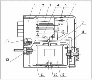 Рисунок 1.11 – Промежуточное реле ТРПУ-4-4-110В-П [10]: 1 – корпус; 2 – кожух; 3 – пластина подвижная замыкающих контактов; 4 – пластина подвижная размыкающих контактов; 5 – пластины неподвижные контактов; 6 – траверса; 7 – якорь; 8 – угольник; 9 – катушка; 10 – сердечник; 11 – скоба; 12 – крепление; 13 – пружина