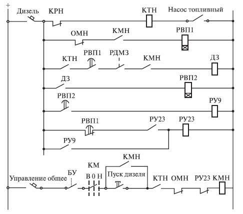 В данном случае размыкающий контакт реле РУ23 разбирает цепь питания катушки контактора КМН; контактор отключается и главным контактом выключает электродвигатель МН и прокачка дизеля маслом прекращается. Вспомогательный контакт КМН разберет цепь питания реле РВП1, которое, отключаясь, своим размыкающим контактом без выдержки времени ставит реле РУ23 на самопитание. Это делает невозможным работу маслопрокачивающего насоса при работающем дизеле, так как насосы с механическим приводом от вала дизеля выходят на требуемый режим.