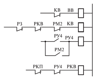 Замыкающий контакт реле РМ2 собирает цепь питания катушки реле РУ4, которое с помощью своего замыкающего контакта становится на самопитание (замыкающий контакт реле РУ4 в цепи катушки РУ4 шунтирует замыкающий контакт реле РМ2). В результате этого, даже если реле РМ2 отключится, реле РУ4 будет оставаться включенным. Размыкающий контакт реле РУ4 отключает катушку промежуточного реле возбуждения РКВ. Контакт РКВ в цепи катушки КВ также размыкается и вместе с контактом РМ2дублирует ее отключение. Теперь, для того чтобы восстановить возбуждение генератора, нужно отключить реле РМ2 и реле РУ4. А реле РУ4, которое встало на самопитание, отключится только после перевода контроллера на нулевую позицию и выключения автомата «Управление возбуждением». Такой алгоритм защиты от внутренних коротких замыканий позволяет восстанавливать возбуждение тягового генератора только начиная с нулевой позиции.