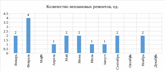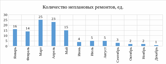 Анализируя диаграмму видно, что наибольшее количество неплановых ремонтов приходится на март месяц (25 случаев), а наименьшее приходится на декабрь месяц (1 случай).