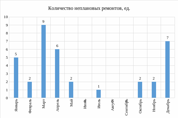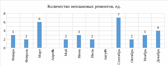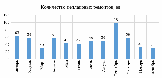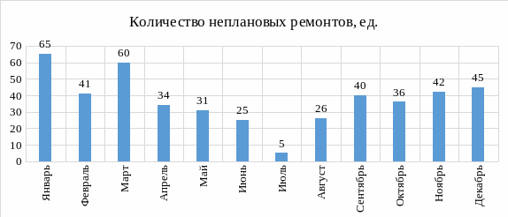 Анализируя диаграмму видно, что наибольшее количество неплановых ремонтов приходится на январь месяц (65 случай), а наименьшее количество неплановых ремонтов приходится на июль месяц (5 случаев).