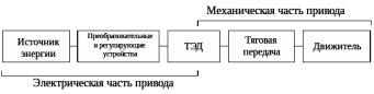В комплектацию электропривода, где электрическая энергия является преобразуемой, входит тяговый двигатель, тяговая передача, регулирующие и преобразовательные. Состав привода представлен на рисунке 2.1.