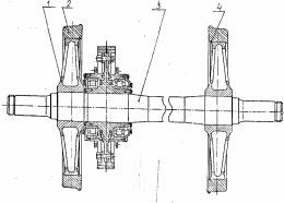 Колесная пара в соответствии с рисунком 2.2 состоит из оси с зубчатым колесом 3, ездовых колес, состоящих из колесных центров 1, бандажных колец 4, бандажей 2.