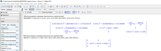 После добавления всех переменных и их значений участвующих в процессе реализации АЧХ динамической модели, создаем массив данных для матрицы динамических жесткостей представленной ранее в таблице 5.1. Результат реализации в программном комплексе Maple изображен на рисунке 5.7.