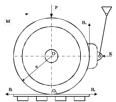 При торможении колодочным тормозом (рисунок 4.3) тормозная колодка прижимается к колесу с некоторой силой - К. В результате механического и молекулярного взаимодействия вращающегося колеса и колодки возникает касательная сила трения колодки о колесо – ВТ, препятствующая вращению колеса, величина которой определяется из соотношения