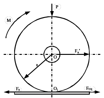 колесо катится по рельсу без скольжения. При Fк > Fсц только часть силы Fк