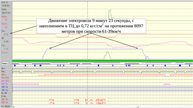 Применение машинистом вспомогательного тормоза в режиме тяги на протяжении 4 минут 32 секунд, с повышением давления в тормозных цилиндрах до 0,48 кгс/см2 на протяжении 3435 метров при скорости 35-58 км/ч.