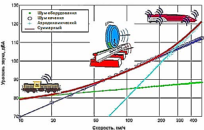 Шум оборудования (компрессоры, тяговые электродвигатели и др.) превалирует на скоростях до 50-60 км/ч. Шум качения – процесс соударения в системе «колесо – рельс» определяется зависимостью 30lgV (V – скорость движения, км/ч) и превалирует в диапазоне скоростей 60-200 км/час.
