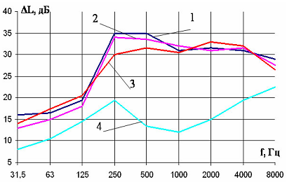 На рисунке 3.5 показан эффект снижения шума выемкой: на низких частотах (31,5-125 Гц) эффект (по сравнению с плоским участком) составляет 4-5 дБ, в средне- высокочастотном диапазонах (500-4000 Гц) эффект достигает 12-18 дБ; дополнительное снижение УЗ (по сравнению с плоским участком) достигает 15дБА.