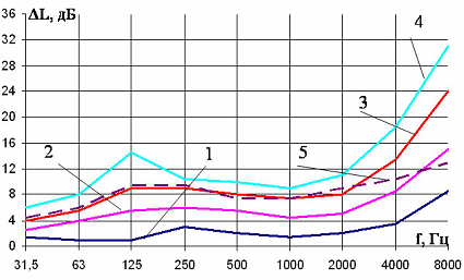Затухание за счет поглощения звука зеленым покровом происходит на всех частотах, но т.к. коэффициент звукопоглощения листвы (αл) имеет небольшое значение на частоте 63 Гц, то на этой частоте снижение УЗД меньше, чем в остальном частотном диапазоне.