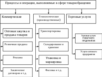 Торговые (коммерческие) процессы направлены на то, чтобы осуществление купли-продажи c целью получения прибыли и связаны со сменой форм стоимости. К ним примыкают также такие торговые процессы, без которых невозможно нормальное проведение операций купли-продажи. Это организация коммерческих связей между продавцами и покупателями, изучение покупательского спроса на товары, сбытовая реклама, сервисное обслуживание клиентов, в том числе выполнение для них некоторых дополнительных услуг, страхование товаров при их доставке покупателям. Операции купли-продажи c примыкающими торговыми процессами представляют собой торговлю в широком смысле слова.