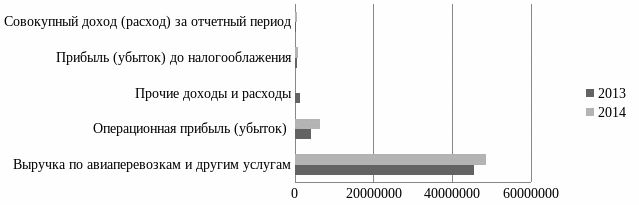 - выручка по авиаперевозкам и другим услугам в 2014 г. составила 48602491 тыс. руб., в 2013 г. – 45511548 тыс. руб., увеличившись на 6,79 % или на 3090943 тыс. руб.