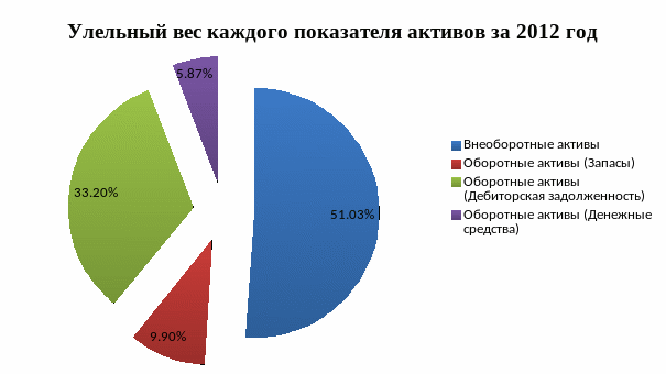 Рисунок 2.6. Удельный вес каждого показателя активов за 2012 г.