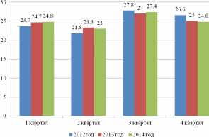 Доля оборота первого квартала возросла с 24,7% в 2013 году до 24,8% в 2014 году (темп роста оборота в этом квартале 102,4%), а доля оборота третьего квартала составила в 2014 году 27,4% и возросла по сравнению с 2013 годом на 0,4% (темп роста товарооборота – 103,5%). Таким образом, товарооборот предприятия по кварталам года распределялся неравномерно и развивался неритмично.