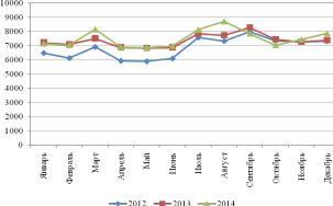 Рисунок 5 – Ритмичность развития розничного товарооборота магазина «Азбука детства» за 2012 – 2014 гг. по месяцам года