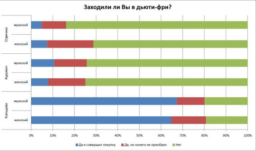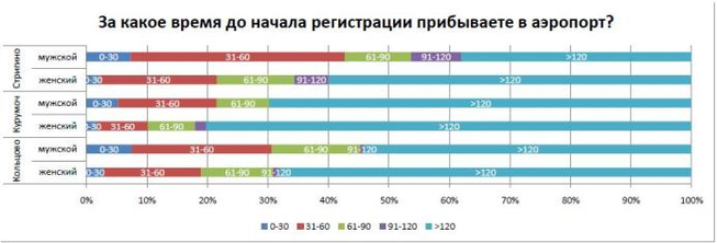 Для этого необходимо проводить регулярный анализ работы операторов в собственном аэропорту, портрета пассажиров, а также их потребностей. Ежегодно каждому аэропорту стоит проводить опрос пассажиров с выборкой не менее 1 тыс. человек независимо от размера аэропорта и величины пассажиропотока, это позволяет прогнозировать изменения в доходах от неавиационной деятельности. Анализы представлены на рисунках 1.4; 1,5; 1.6; 1.7 [10].