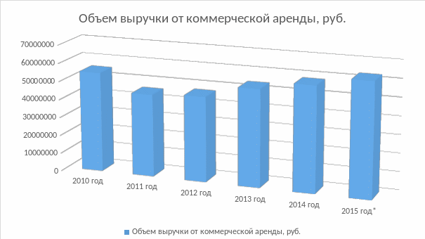 Вывод: по диаграмме видно, как упал объём выручки от коммерческой аренды в 2011-2012 году по сравнению с 2010 годом. В 2013 и 2014 году объём выручки снова стал расти. Также виден прогнозируемый рост объёма выручки в 2015 году.