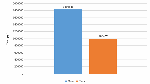 Согласно данных таблицы плановое значение по добыче угля составляло 1830546 тыс. руб., а фактически было произведено только 986457 тыс. руб.