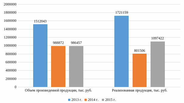 Анализ динамики объемом производства и реализации говорит о сокращении их темпов роста. Так к 2015 г. в сравнении с 2013 г. объем производства составил лишь 65,24%, а реализованной продукции – 63,76%. Превышение объемов реализации над объемом производства свидетельствуют об избавлении от остатков продукции. Объемы производства
