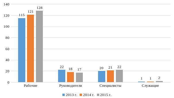 Данные таблицы говорят о том, что существенных структурных сдвигов в категориях работников не произошло. Наибольший удельный вес (более 70%) занимают рабочие: в 2013 г. – 72,78%, 2014 г. – 75,16%, в 2015 г. – 75,74%.