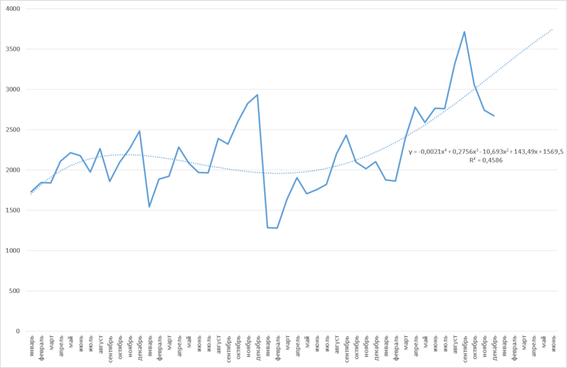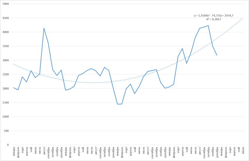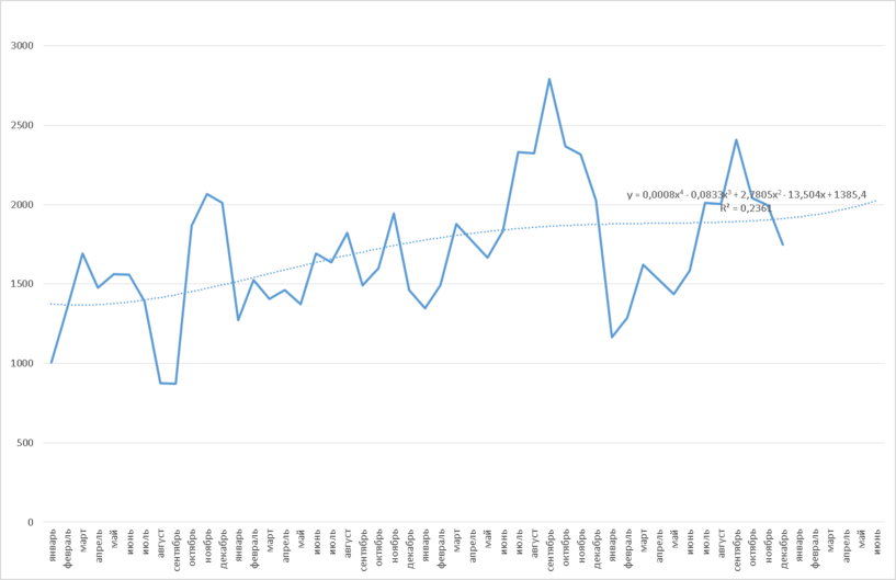 В данном случае задачей будет являться экстраполяция общих закономерностей на перспективный период и определение объемов выгрузки, погрузки грузов в крупнотоннажных контейнерах в июне 2015 года. Благодаря ей, возможно осуществить описание некоторого общего будущего развития объекта прогнозирования на основе относительно небольшого объема информации, а также простоты и ясности принятых допущений. Причем, если развитие в прошлом носило скачкообразный характер, то при достаточно продолжительном периоде наблюдений скачки оказываются «зафиксированными» в самом тренде. Основная тенденция развития данного процесса или детерминированная величина определена по формуле (2.1). Требуется определить случайную компоненту, а затем осуществить экстраполяцию.