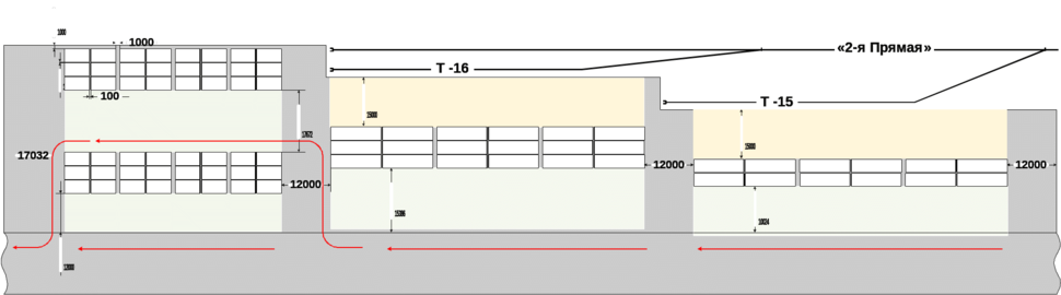 Ширину полосы для движения автомобильных прицепов необходимо принять в зависимости от типа автомобильного транспорта, погрузочно-разгрузочных машин, интенсивности работы и др. Ширина полосы на Новой площадке составляет 15,03 м.