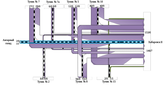 Поскольку в избытке оказались 1 крытый вагон, 1 полувагон и 5 фитинговых платформ, то эти порожние вагоны отправляются на сортировочную станцию Хабаровск II.