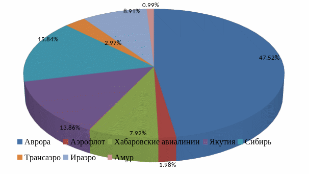 Внутренние перевозки осуществляют 8 российских авиакомпаний. На рисунке 2.2 представлена структура распределения самолетовылетов в Хабаровском аэропорту по авиакомпаниям.