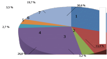 Рисунок 1.1 – Распределение постановок тепловозов на неплановый ремонт по видам оборудования: 1 – дизель; 2 – вспомогательное оборудование; 3 – тормозное оборудование; 4 – электронное оборудование; 5 – колесная пара с буксами; 6 – моторно-осевые подшипники; 7 – прочее оборудование