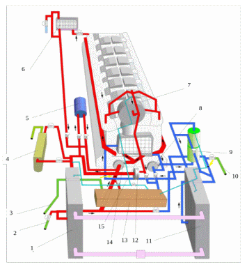 Рисунок 4.6 – Расположение устройств стационарного обогрева систем тепловозов в локомотивном депо Новый Ургал. 1 – котельная; 2 – участок ТО-2 и экипировки; 3 – служебно-бытовой корпус; 4 – мастерские и вспомогательные цеха; 5 – цех ТО-3 и ТР-1; 6 – цех ТО-4 и ТР-2; 7 – пескосушильные и пескозаправочные устройства; 8 – крытая эстакада с кантователем для ремонта дизелей; 9 – склад сухого песка; 10 – склад тарного хранения; 11 – заглубленный склад; 12 – склад горюче-смазочных материалов; 13 - эстакада для слива дизельного топлива; 14 – реостатная станция, пункт экологического контроля; 15 – станция диагностики дизелей.