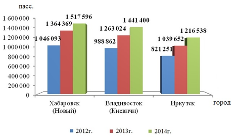 Рис.2 Международный пассажиропоток по аэропортам Хабаровск (Новый), Владивосток (Кневичи), Иркутск 2012-2014гг.