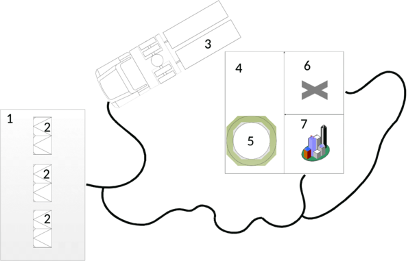 1-площадка для контейнеров; 2-кониейнеры с мусором; 3- мобильно-стационарный комплекс переработки твердых бытовых отходов контейнерного исполнения; 4- полигон ТБО; 5-складируемый мусор; 6-полигон для не разлагаемых отходов; 7-полигон для биоразлагаемых отходов.