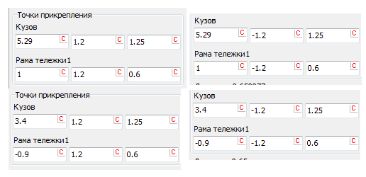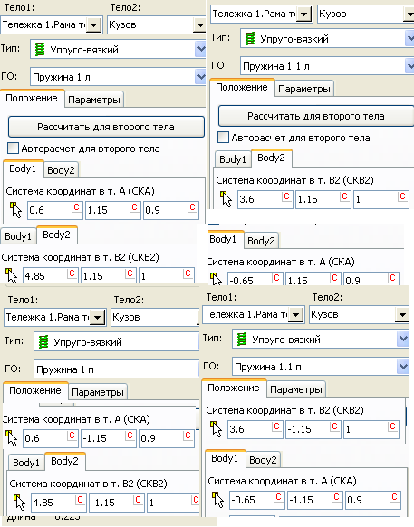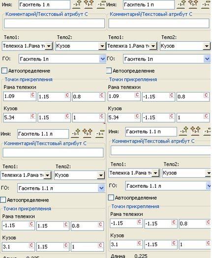- получив две пружины, необходимо создать еще 6, для этого копируются эти элементы и меняются знак точек прикрепления в зависимости от места установки элемента на противоположный;