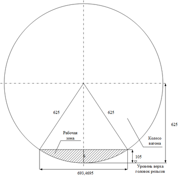 Как видно из рисунков 3.7, 3.8 высота стационарного тягового устройства (индуктора) не должна превышать 105 мм для того чтобы рассчитать длину этого устройства построим рисунок вида с боку колеса и рельса в программе Microsoft Office Visio и найдем длину устройства. Пользуясь геометрическими расчетами найдем рабочую зону колеса и индуктора.