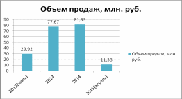 Объем продаж увеличился в 2,6 раза до 77,67 млн. руб. с 29,92 млн. руб. годом ранее. В 2014 году увеличился в 1,04 раза до 81,33 млн. руб. с 77,67млн. руб.