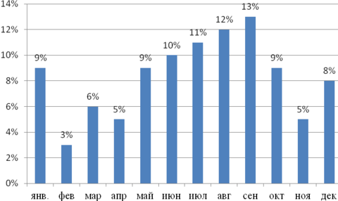 Из ˈрисунка ˈ2.2 ˈвидно, ˈчто ˈв ˈавиаперевозках ˈосновная ˈдоля ˈперелетов ˈприходится ˈна ˈпериод ˈс ˈмая ˈпо ˈсентябрь ˈ(около ˈ55% ˈот ˈобщего ˈколичества ˈпассажиров), ˈв ˈзимний ˈпериод ˈколичество ˈпассажиров ˈзначительно ˈсокращается.