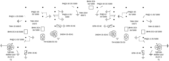 Трансформаторы Т1 и Т2 подключены к шинам РУ-27,5 кВ через ячейки ввода. Они включают в себя выключатели типа ВМК-35Э, линейные разъединители, шинные разъединители типа РНДЗ. Для подключения защит и измерительных приборов предусмотрены ТТ типа ТФН-35.