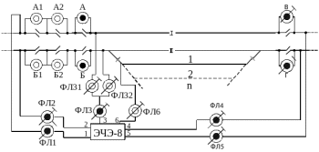 Фидера 1 и 5 питают контактную сеть нечетного пути, а 2 и 4 четного пути. При этом в нормальном режиме фидера 4 и 5 питают и контактную сеть самой станции, то есть ее главные и боковые пути. Фидера 3 подключается к главным путям станции, а 6 к боковым. В нормальном режиме фидера 3 и 6 отключены. На рисунке 1.4 показана схема соединения контактной сети в зоне действия подстанции.