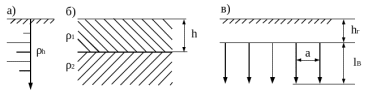- реальный грунт с изменяющимся по глубине удельным сопротивлением ρh заменяется эквивалентной двухслойной структурой с толщиной h и сопротивлениями верхнего и нижнего слоя ρ1 и ρ2 соответственно (Рисунок 5.1, а, б).