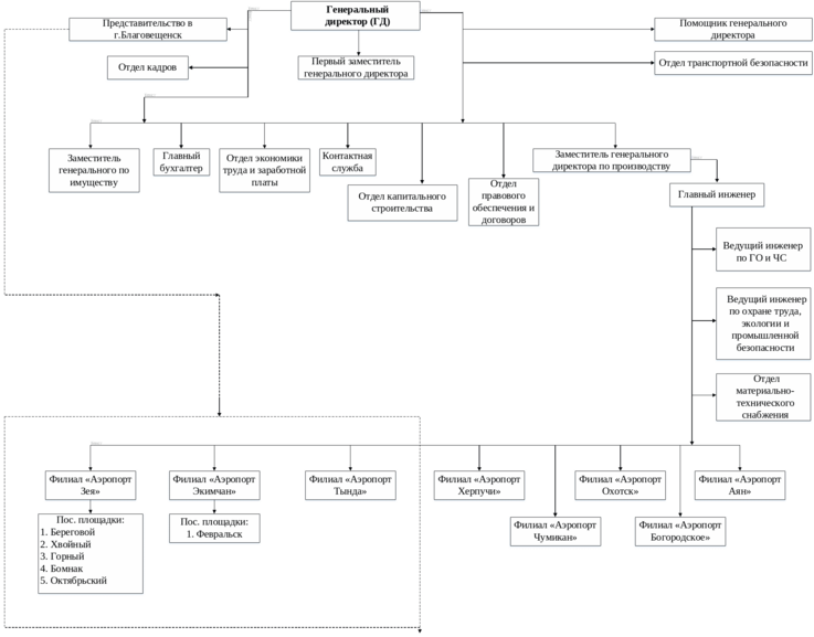 Правовой статус авиапредприятия. Филиал «Аэропорт Богородское» (далее Филиал) является обособленным подразделением ФКП «Аэропорты Дальнего Востока» (далее Предприятие), расположенным вне места нахождения Предприятия, осуществляет защиту его интересов, в том числе функции представительства. Филиал не является юридическим лицом и действует на основании положения «О филиале Федерального Казенного Предприятия «Аэропорты Дальнего Востока» - Аэропорт Богородское», утвержденного приказом генерального директора Предприятия.