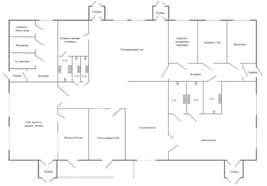 Исходя из полученных результатов можно сделать вывод: для совершенствования технологии обслуживания пассажиров в филиале «Аэропорт Богородское» необходимо увеличить площадь здания аэровокзала, а также разработать рекомендуемую планировку помещений аэровокзала, представленную на Рис. 3.2: