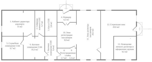 В фактическом плане филиала ФКП «Аэропорты Дальнего Востока» - Аэропорт Богородское отсутствуют некоторые необходимые помещения для обслуживания пассажиров, например – комната матери и ребенка. В данной разработанной планировке помещений филиала ФКП «Аэропорт Богородское» есть весь необходимый состав помещений для обслуживания пассажиров.