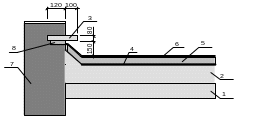 1 - монолитное железобетонное перекрытие, толщиной 180 мм; 2 - лёгкий бетон по уклону; 3 - железобетонная плита; 4 – пароизоляция; 5 – экструдированный пенополистирол 200 мм; 6 - рубероидная кровля К-3А; 7 - кирпичный парапет; 8 - мастика “изол”