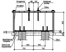 Нарезку анкерных болтов, а также гайки тщательно смазываются маслом и обертываются толем. Заделка болтов выполняется одновременно с бетонированием фундамента. Применяются фундаментные болты марки М24. Снятие кондукторов с опалубки ростверка допускается после достижении бетоном 15% проектной прочности.